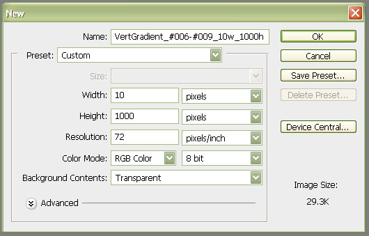 Here is how I made one. In photoshop, choose the file>new option and fill in the menu to set up a working image that is 10 pixels wide and 1000 pixels high. Name it to reflect the colors at the end of the gradient and the image size, as follows: