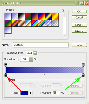 In the gradient select window, click on the left color stop (red arrow) and set the darker color (#000099). Click on the right color stop (green arrow) and set the lighter color (#000066). Click OK.
