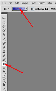 Choose the gradient tool (lower arrow pointing to tool bar) and click on the gradient drop down icon (upper arrow) to open the gradient editor.