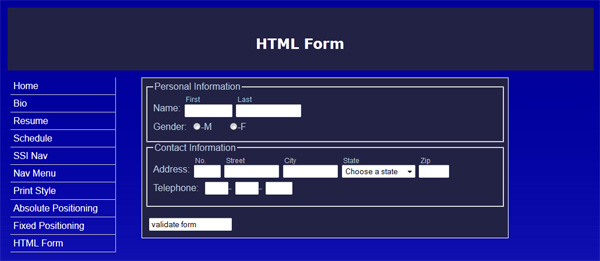Load the absolute position page from the , "8_absolute_positioning.shtml," task 8 and saving as "10_html_form.shtml". Add this new page to your navigation file with the link "html form."