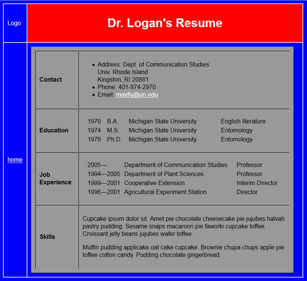 - The education and job experience cells contain 4- and 3-column tables (yes, these tables are nested 3-deep!). Attempt this for yourself. If you need help, click on the image to be taken to the actual html page that I used to produce the image; use the browser's tools>web developer>page source menu (firefox) to see the html that I used. Don't copy and paste without understanding exactly how this works (hint: when you do understand, use dreamweaver to set up each table within the resume table).