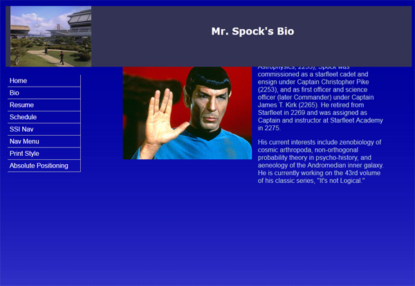 Load the absolute position page from the , "8_absolute_positioning.shtml," previous task (8) and saving as "9_fixed_positioning.shtml". Add this new page to your navigation file with the link "fixed position."