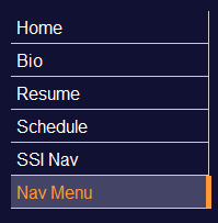 Begin by loading 5_ssi_for_nav.shtml (task 5) and saving as "6_nav_style.shtml". (i.e., the content will be your schedule. To provide some variety, if you would like to use your bio or resume, you may elect to start by loading them instead; be sure to update with links to your external screen style sheet and the navigation server-side include.)