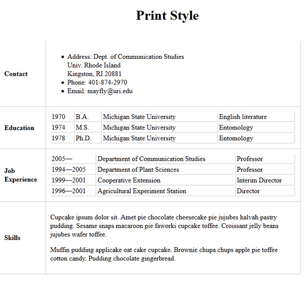 Begin by loading 3_html_resume.shtml (task 3) and saving as "7_print_style.shtml". (i.e., the content will be your resume table. Update with links to your external screen style sheet and by replacing any navigation with the navigation server-side include. Add a link to your navigation file with the text "Print Style."